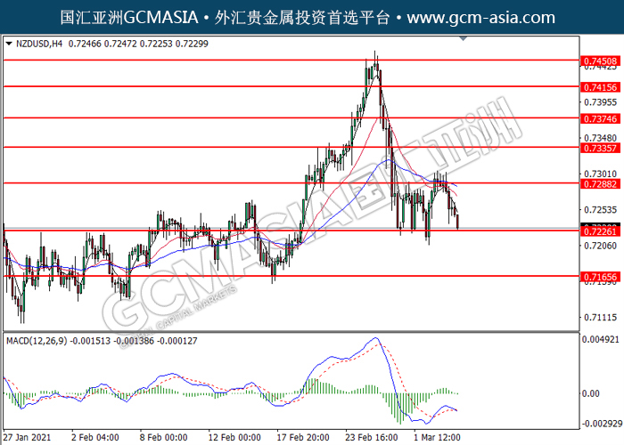 NZDUSD,H4: 纽美高位承压后回落,目前测试着支撑位。MACD转向空头,动能略减,若突破可关注空头为主。上方关注0.7290和0.7335压力,下方关注0.7225支撑和0.7165支撑。