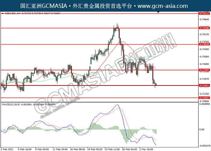 20210305 NZDUSD-午间 by keyk | Mar 5, 2021 | 纽元兑美元 | 0 comments GCMAsia-NZDUSD NZDUSD 2021-03-05 NZDUSD,H4: 纽美震荡下行,目前测试前期支撑。MACD空头动能略增,若下破可关注空头为主。上方关注0.7240和0.7365压力,下方关注0.7165支撑和0.7105支撑。
