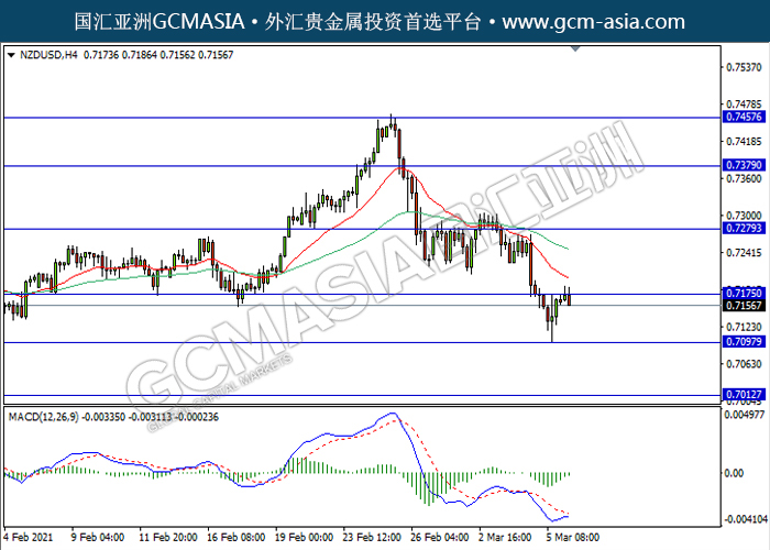 NZDUSD,H4: 纽美近期低位反弹,目前测试前期压力。MACD显示多头信号,空头动能略减,若突破可继续关注多头反弹趋势为主。上方关注0.7175和0.7280压力,下方关注0.7095支撑和0.7010支撑。