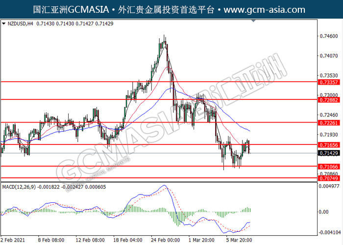 20210310 NZDUSD-午间 by keyk | Mar 10, 2021 | 纽元兑美元 | 0 comments GCMAsia-NZDUSD NZDUSD 2021-03-10 NZDUSD,H4: 纽美高位承压后回落。MACD转向空头,动能略减,短期可关注空头为主。上方关注0.7165和0.7225压力,下方关注0.7105支撑和0.7075支撑。