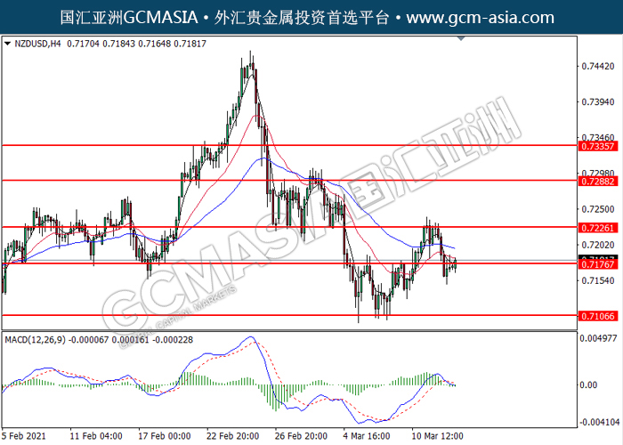 NZDUSD,H4: 纽美低位反弹,目前测试着压力位。由于MACD并没有任何信号,建议等到更多信号出现后才进入市场。上方关注0.7175和0.7225压力,下方关注0.7105支撑和0.7075支撑。