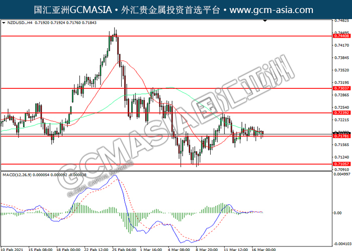 20210317 NZDUSD-午间 by keyk | Mar 17, 2021 | 纽元兑美元 | 0 comments GCMAsia-NZDUSD NZDUSD 2021-03-17 NZDUSD,H4: 纽美震荡盘整,目前测试前期支撑。MACD空头动能略增,若下破可关注空头为主。上方关注0.7240和0.7365压力,下方关注0.7180支撑和0.7105支撑。