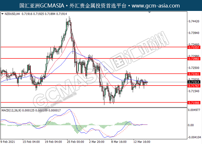 NZDUSD,H4: 纽美低位反弹。由于MACD并没有显示任何信号,建议等到更多信号出现后才进入市场。上方关注0.7225和0.7290压力,下方关注0.7175支撑和0.7105支撑。