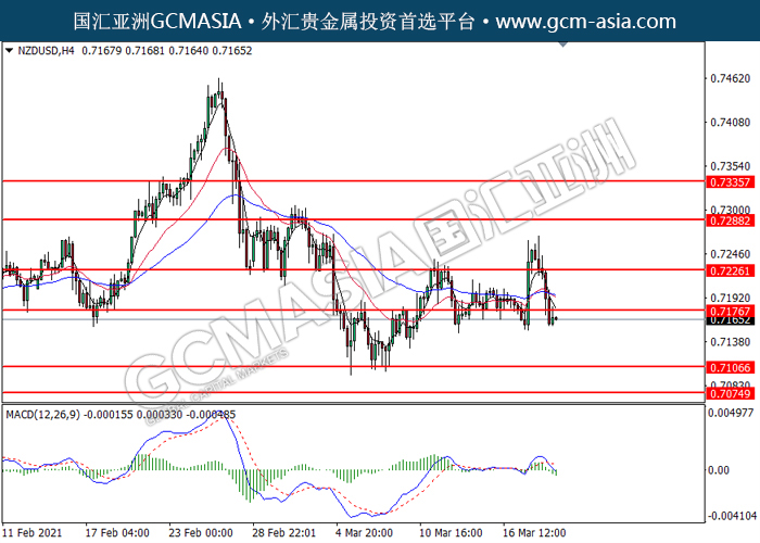 NZDUSD,H4: 纽美突破后持续下行。MACD显示空头信号,动能略减,短期可关注空头趋势。上方关注0.7175和0.7225压力,下方关注0.7105支撑和0.7075支撑。