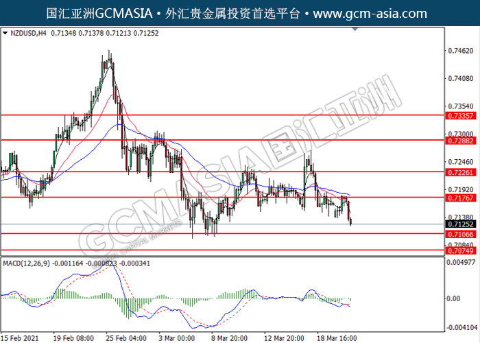 NZDUSD,H4: 纽美高位承压后回落。MACD显示空头信号,动能略减,短期可关注空头趋势。上方关注0.7175和0.7225压力,下方关注0.7105支撑和0.7075支撑。