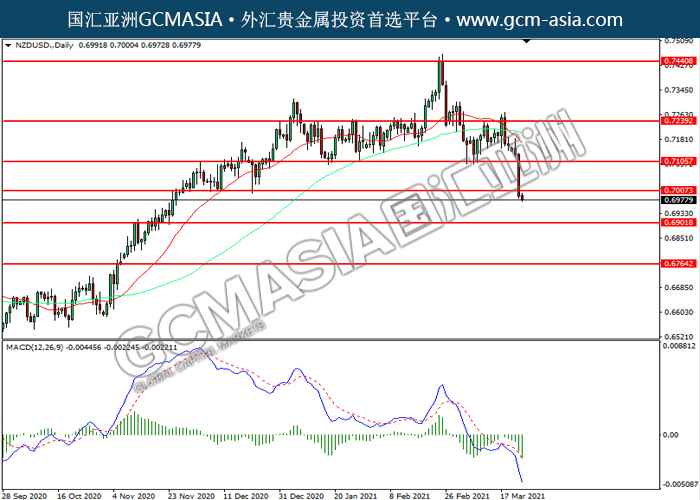NZDUSD,Daily: 纽美下破前期支撑,持续下行。MACD空头动能略增,短期可关注空头趋势为主。上方关注0.7005和0.7105压力,下方关注0.6900支撑和0.6765支撑。
