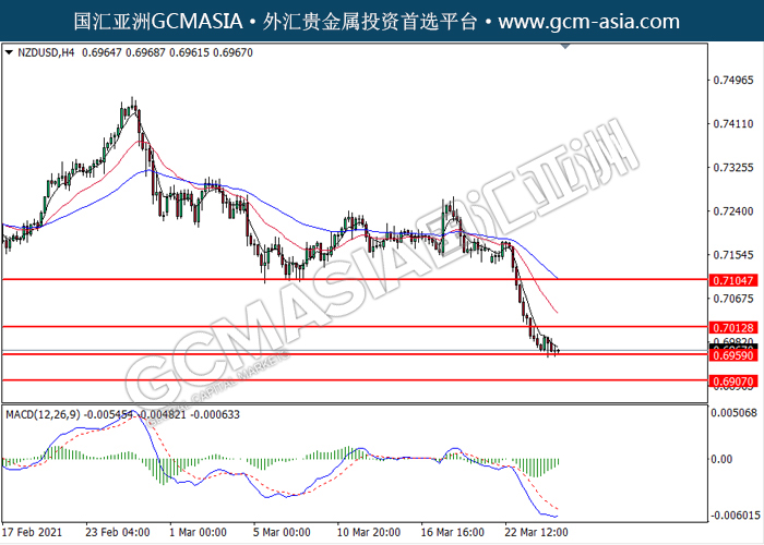 NZDUSD,H4: 纽美高位承压后回落,目前测试着支撑位。然而,MACD显示多头信号,动能略增,短期可关注技术性上调。上方关注0.7015和0.7105压力,下方关注0.6960支撑和0.6905支撑。