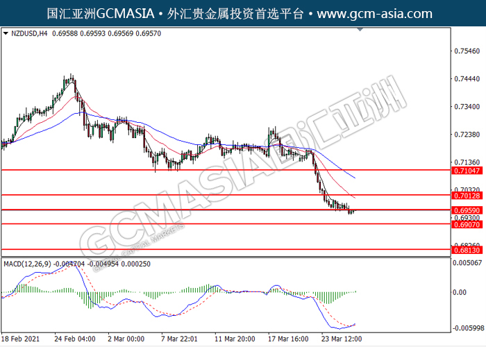 NZDUSD,H4: 纽美震荡于压力位下方,目前测试着压力位。MACD显示多头信号,动能略增,若突破可关注多头趋势。上方关注0.6560和0.7015压力,下方关注0.6905支撑和0.6815支撑。