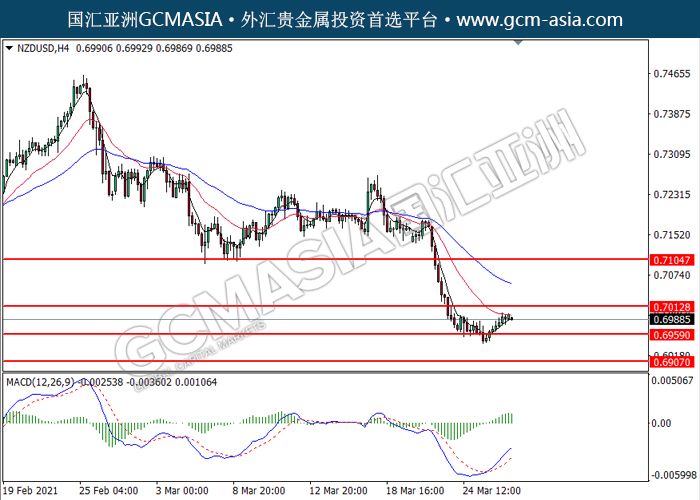 20210329 NZDUSD by willy | Mar 28, 2021 | 纽元兑美元 | 0 comments GCMAsia - NZDUSD NZDUSD 2021-03-29 NZDUSD,H4: 纽美低位反弹。MACD显示多头信号,动能略增,短期可关注多头趋势。上方关注0.7015和0.7105压力,下方关注0.6960支撑和0.6905支撑。