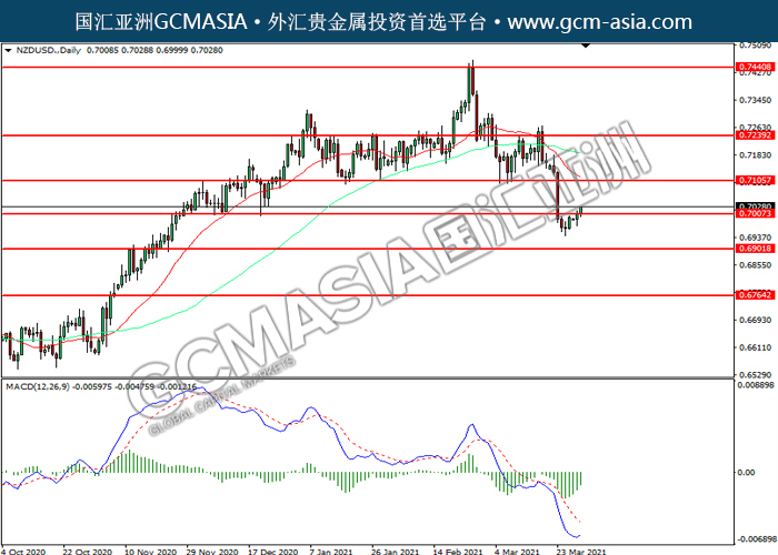 20210330 NZDUSD-午间 by keyk | Mar 30, 2021 | 纽元兑美元 | 0 comments GCMAsia-NZDUSD NZDUSD 2021-03-30 NZDUSD,Daily: 纽美震荡上行。MACD空头动能略减,若突破可关注多头为主。上方关注0.7105和0.7240压力,下方关注0.7005支撑和0.6900支撑。