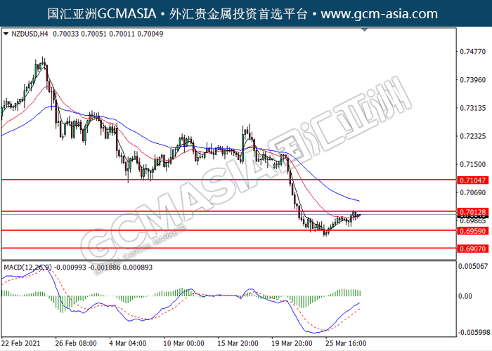NZDUSD,H4: 纽美低位反弹,目前测试着压力位。MACD显示多头信号,动能略增,若突破可关注多头趋势。上方关注0.7015和0.7105压力,下方关注0.6960支撑和0.6905支撑。
