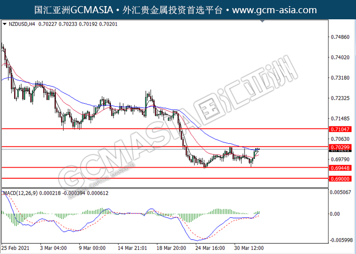 NZDUSD,H4: 纽美突破后持续上行,目前测试着压力位。MACD显示多头信号,动能略增,若突破可关注多头趋势。上方关注0.7030和0.7105压力,下方关注0.6945支撑和0.6900支撑。