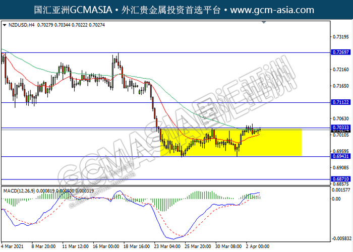 NZDUSD,H4: 纽美仍区间交易,目前测试靠近压力。然而,MACD多头动能略减,短期关注空头方向为主。上方关注0.7035和0.7110压力,下方关注0.6945支撑和0.6870支撑。