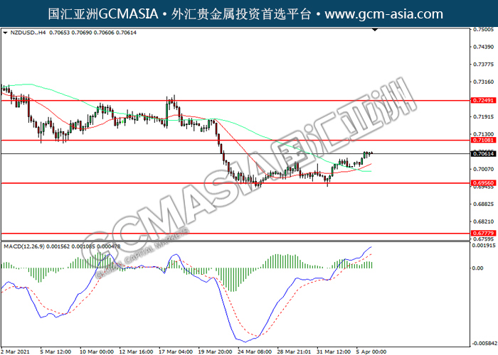 NZDUSD,H4: 纽美震荡上行。然而,MACD多头动能略减,短期可关注技术性回调为主。上方关注0.7110和0.7250压力,下方关注0.6955支撑和0.6775支撑。