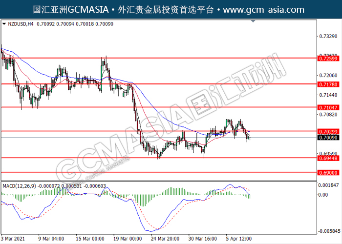 NZDUSD,H4: 纽美突破后持续下行。MACD显示空头信号,动能略减,短期可关注空头趋势。上方关注0.7030和0.7105压力,下方关注0.6945支撑和0.6900支撑。