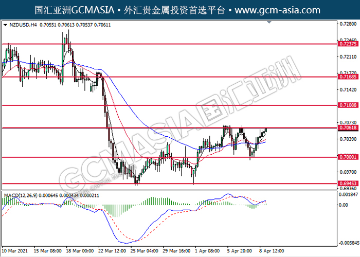 NZDUSD,H4: 纽美低位反弹,目前测试着压力位。MACD显示多头信号,动能略增,若突破可关注多头趋势。上方关注0.7060和0.7110压力,下方关注0.7000支撑和0.6945支撑。