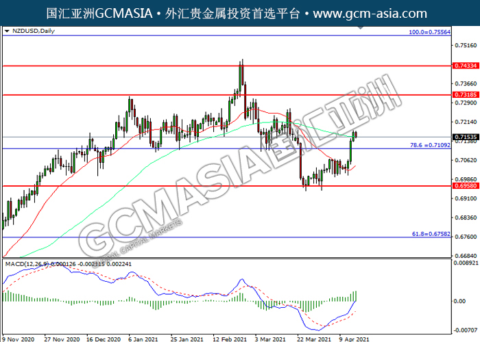 20210416 NZDUSD-午间 by keyk | Apr 16, 2021 | 纽元兑美元 | 0 comments GCMAsia-NZDUSD NZDUSD 2021-04-16 NZDUSD,Daily: 纽美突破前期压力,震荡上行。MACD多头动能略增,短期可关注多头为主。上方关注0.7320和0.7435压力,下方关注0.7110支撑和0.6960支撑。