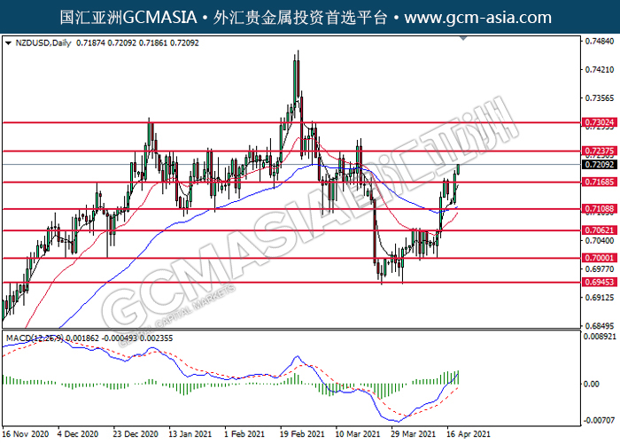 NZDUSD,Daily: 纽美突破后持续上行。MACD显示多头信号,动能略增,短期可关注多头趋势。上方关注0.7235和0.7300压力,下方关注0.7170支撑和0.7110支撑。