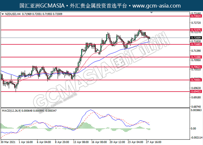 NZDUSD,H4: 纽美高位承压后回落。MACD显示空头信号,动能略减,短期可关注空头趋势。上方关注0.7235和0.7300压力,下方关注0.7170支撑和0.7110支撑。