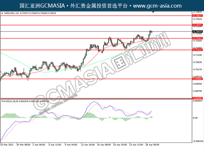 20210429 NZDUSD by willy | Apr 28, 2021 | 纽元兑美元 | 0 comments GCMAsia-NZDUSD NZDUSD 2021-04-29 NZDUSD,H4: 纽美突破前期压力,震荡上行。MACD多头动能略增,短期可关注多头为主。上方关注0.7300和0.7365压力,下方关注0.7115支撑和0.7140支撑。