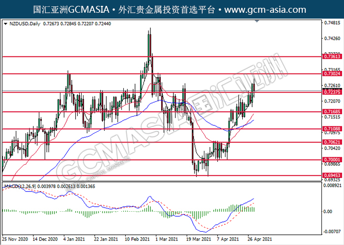 NZDUSD,Daily: 纽美突破后持续上行。MACD显示多头信号,动能略增,短期可关注多头趋势。上方关注0.7300和0.7360压力,下方关注0.7235支撑和0.7170支撑。