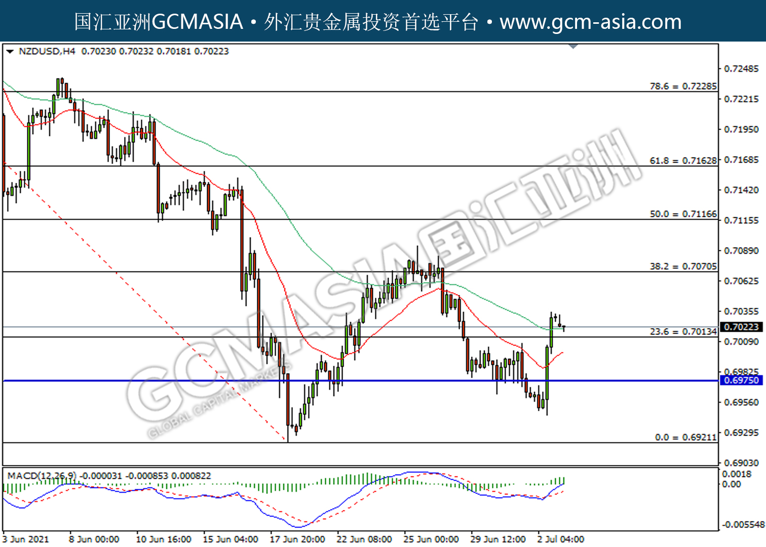 NZDUSD,H4: 纽美受承压回落。MACD多头动能有所略减,短期关注空头为主。上方关注0.7070和0.7115压力,下方关注0.7015支撑和0.6975支撑。