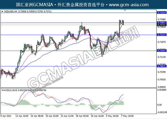 20210510 NZDUSD-午间 by keyk | May 10, 2021 | 纽元兑美元 | 0 comments GCMAsia-NZDUSD NZDUSD 2021-05-10 NZDUSD,H4: 纽美高位承压回落。MACD多头动能略减,短期可继续看空回调为主。上方关注0.7280和0.7330压力,下方关注0.7220支撑和0.7145支撑。