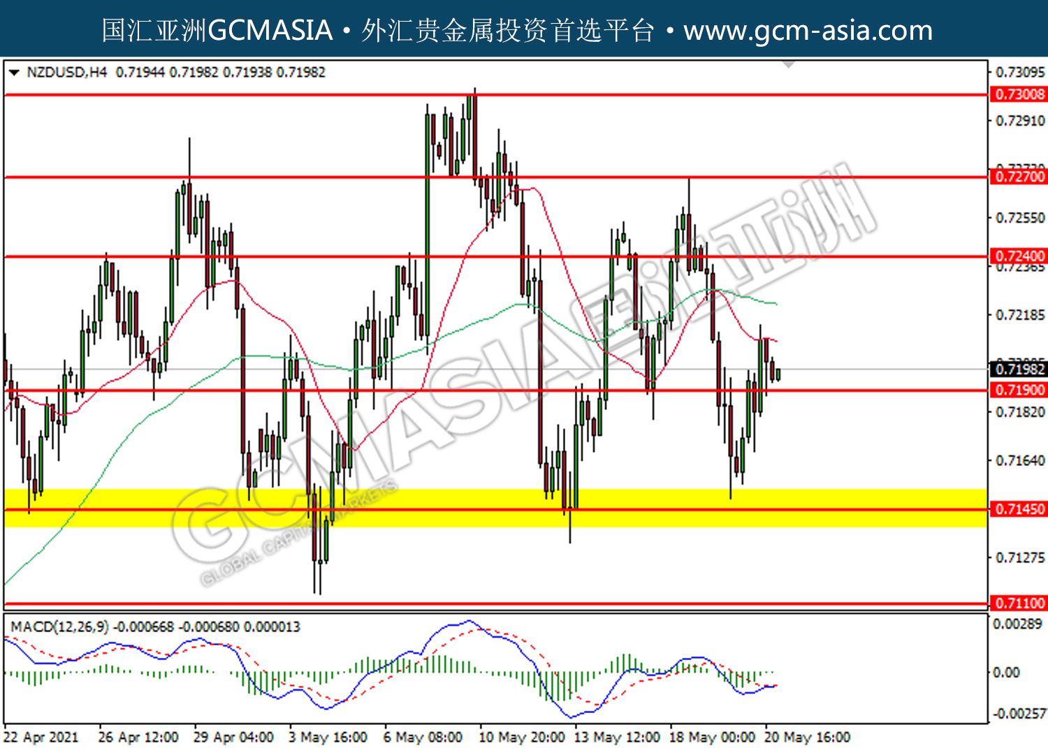 20210521-NZDUSD by willy | May 21, 2021 | 纽元兑美元 | 0 comments NZDUSD,H4: 纽美低位反弹。MACD已形成金叉,短期可关注多头为主。上方关注0.7240和0.7270压力,下方关注0.7190支撑和0.7145支撑。