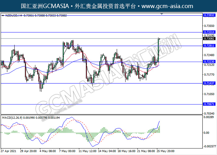 20210526 NZDUSD-午间 by keyk | May 26, 2021 | 纽元兑美元 | 0 comments GCMAsia-NZDUSD NZDUSD 2021-05-26 NZDUSD,H4: 纽美突破前期压力,多头排列。MACD动能持续略增,短期继续看多为主。上方关注0.7330和0.7390压力,下方关注0.7280支撑和0.7225支撑。