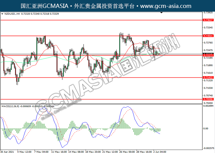 NZDUSD,H4: 纽美震荡下行,目前测试前期支撑。然而,MACD空头动能略减,短期可关注技术性回调为主。上方关注0.7300和0.7360压力,下方关注0.7240支撑和0.7140支撑。
