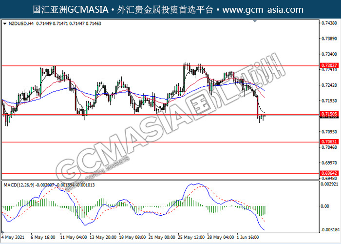 NZDUSD,H4: 纽美震荡盘整,目前测试前期压力。然而,MACD空头动能有所略减,若突破关注多头方向为主。上方关注0.7150和0.7300压力,下方关注0.7065支撑和0.6965支撑。