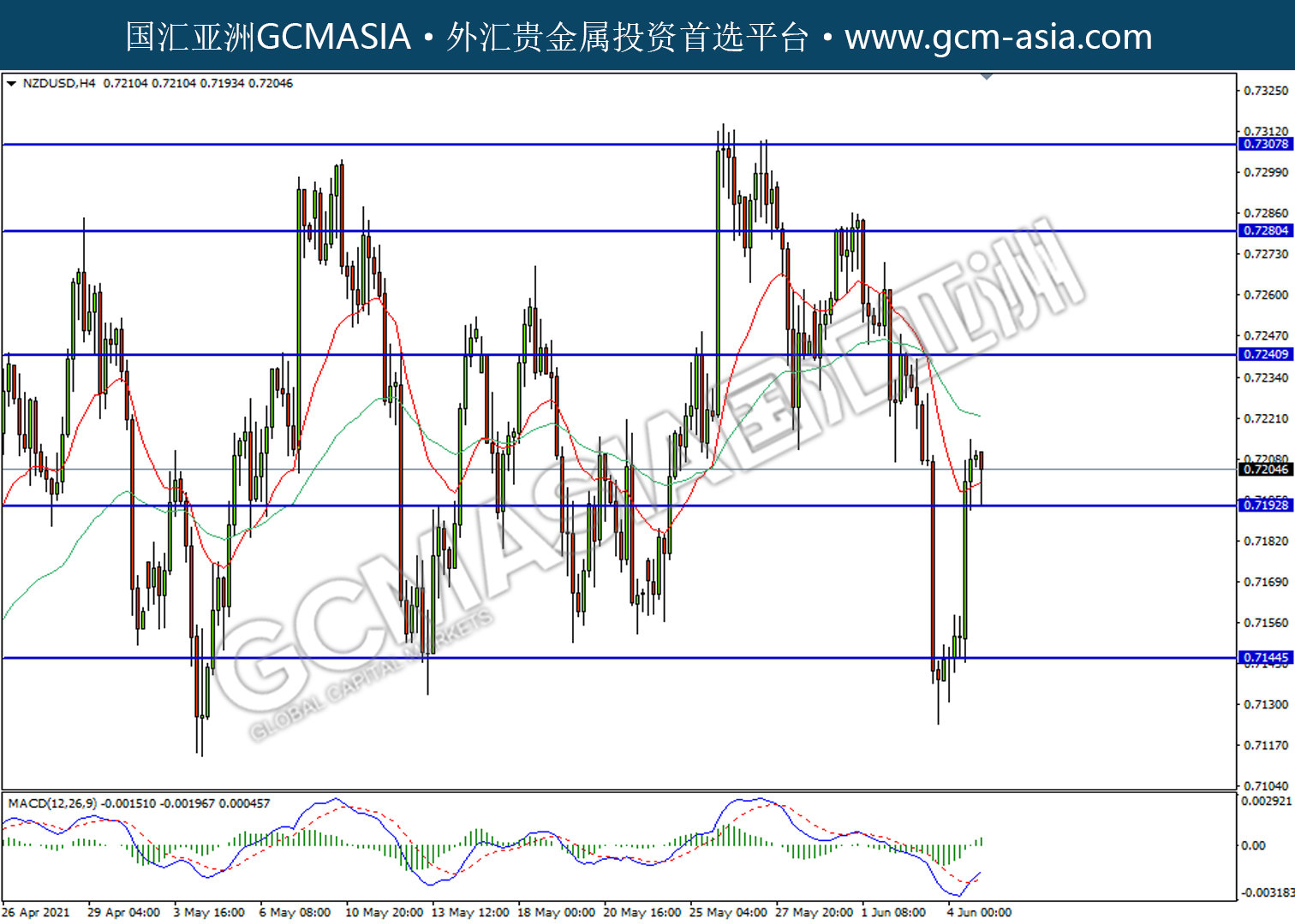NZDUSD,H4: 纽美低位反弹。MACD多头动能略增,短期可关注多头为主。上方关注0.7240和0.7280压力,下方关注0.7192支撑和0.7144支撑。