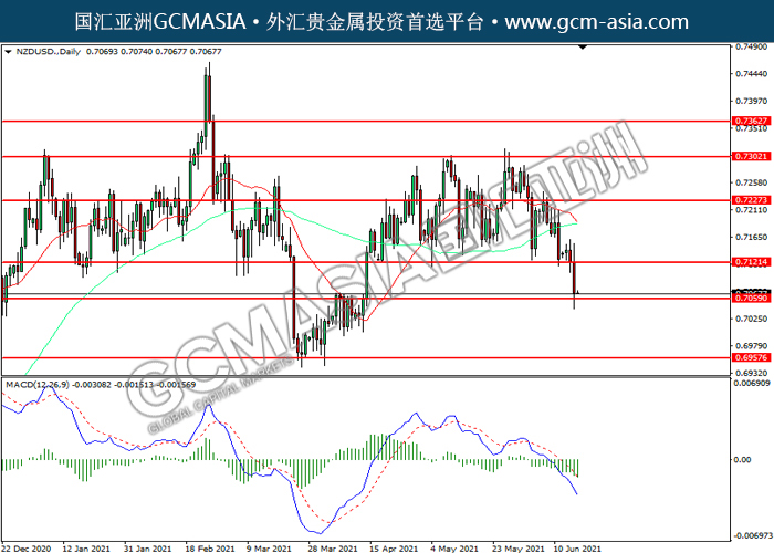 20210617 NZDUSD by willy | Jun 17, 2021 | 纽元兑美元 | 0 comments NZDUSD,Daily: 纽美震荡下行,目前测试前期支撑。MACD空头动能略增,若下破可关注空头为主。上方关注0.7120和0.7225压力,下方关注0.7060支撑和0.6955支撑。
