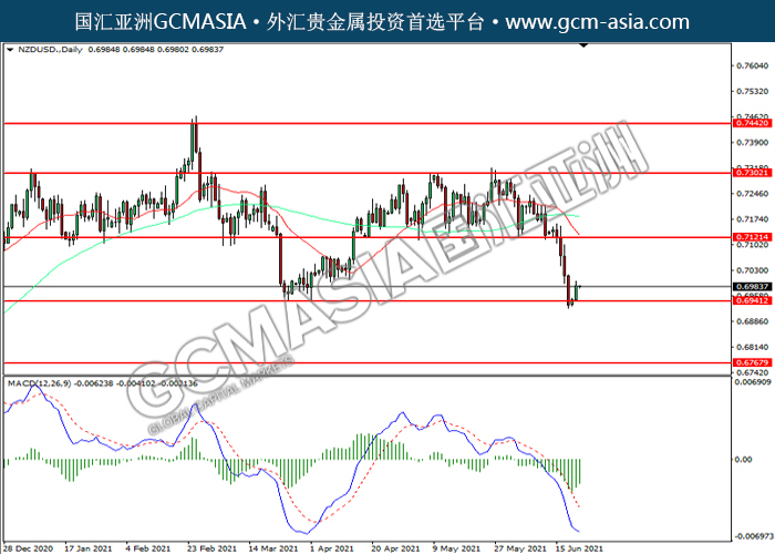 20210622 NZDUSD by willy | Jun 22, 2021 | 纽元兑美元 | 0 comments NZDUSD,Daily: 纽美震荡上行。MACD空头动能略减,短期可关注多头为主。上方关注0.7120和0.7300压力,下方关注0.6940支撑和0.6770支撑。