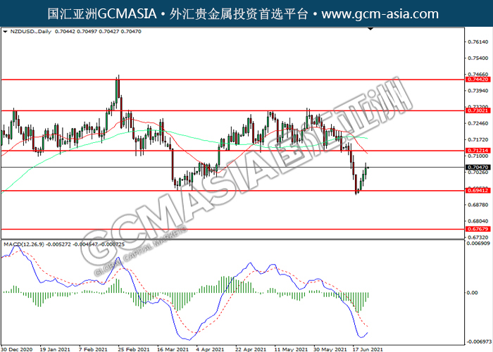 20210624 NZDUSD by willy | Jun 24, 2021 | 纽元兑美元 | 0 comments NZDUSD,Daily: 纽美震荡上行。MACD空头动能略减,短期可关注多头为主。上方关注0.7120和0.7300压力,下方关注0.6940支撑和0.6770支撑。