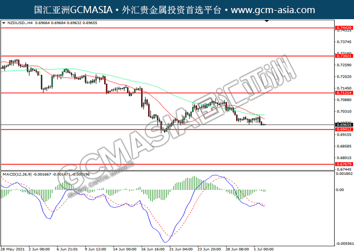 20210702 NZDUSD by willy | Jul 2, 2021 | 纽元兑美元 | 0 comments NZDUSD,H4: 纽美震荡下行,目前测试前期支撑。MACD空头动能略增,若下破可关注空头为主。上方关注0.7120和0.7300压力,下方关注0.6940支撑和0.6770支撑。