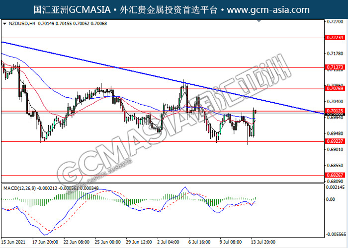 20210714 NZDUSD-午间 by keyk | Jul 14, 2021 | 纽元兑美元 | 0 comments NZDUSD,H4: 纽美多头排列,目前测试前期压力。MACD形成金叉,动能略增,若突破可继续看多为主。上方关注0.7010和0.7075压力,下方关注0.6925支撑和0.6825支撑。