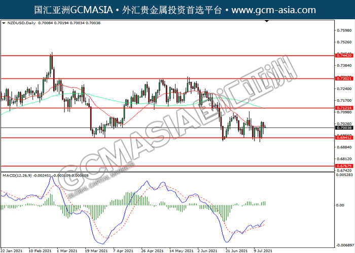 20210716 NZDUSD by willy | Jul 16, 2021 | 纽元兑美元 | 0 comments NZDUSD,Daily: 纽美震荡上行。MACD多头动能略增,短期关注多头为主。上方关注0.7120和0.7305压力,下方关注0.6940支撑和0.6770支撑。