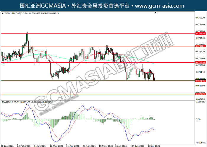 20210720 NZDUSD-午间 by willy | Jul 20, 2021 | 纽元兑美元 | 0 comments NZDUSD,Daily: 纽美震荡下行,目前测试前期支撑。MACD空头动能略增,若下破可关注空头为主。上方关注0.7120和0.7305压力,下方关注0.6915支撑和0.6770支撑。