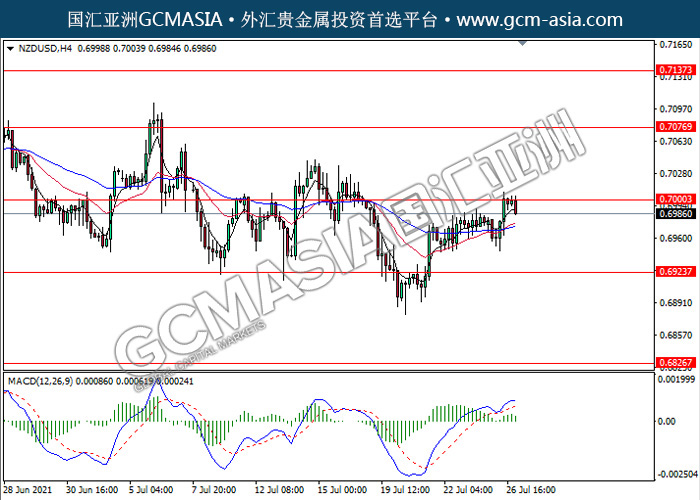 NZDUSD,H4: 纽美高位承压回落。MACD多头动能略减,短期可继续看空回调为主。上方关注0.7000和0.7075压力,下方关注0.6925支撑和0.6825支撑。