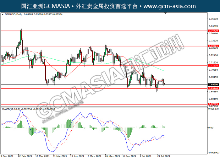 20210728 NZDUSD by willy | Jul 28, 2021 | 纽元兑美元 | 0 comments NZDUSD,Daily: 纽美震荡下行,目前测试前期支撑。MACD多头动能略减,若突破可关注空头为主。上方关注0.7120和0.7305压力,下方关注0.6915支撑和0.6770支撑。