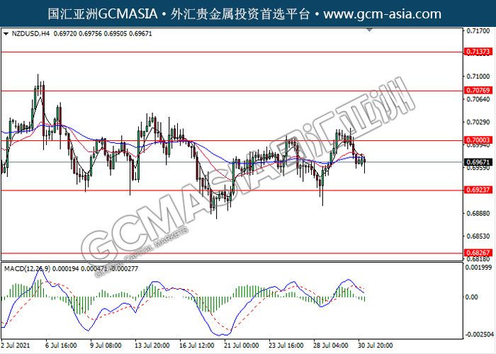 20210802 NZDUSD-午间 by keyk | Aug 2, 2021 | 纽元兑美元 | 0 comments NZDUSD,H4: 纽美高位承压回落。MACD形成死叉,动能略减,短期可继续看空回调为主。上方关注0.7000和0.7075压力,下方关注0.6925支撑和0.6825支撑。
