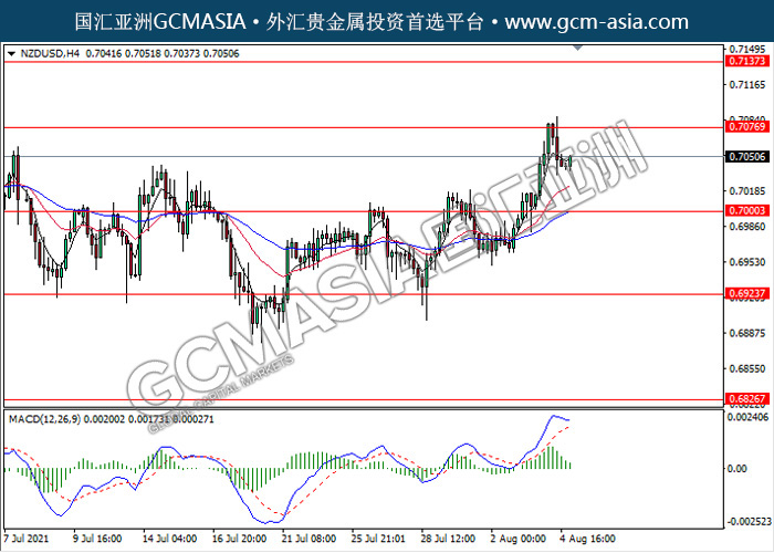 20210805 NZDUSD-午间 by keyk | Aug 5, 2021 | 纽元兑美元 | 0 comments NZDUSD,H4: 纽美高位承压回落。MACD多头动能略减,短期继续看空回调为主。上方关注0.7075和0.7135压力,下方关注0.7000支撑和0.6925支撑。