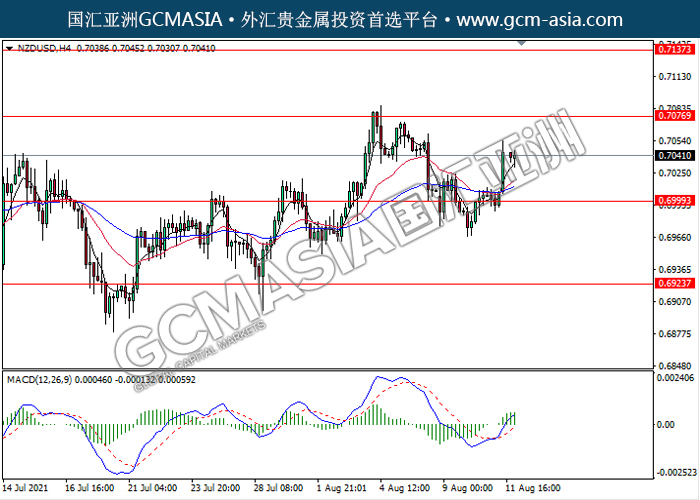 20210812 NZDUSD-午间 by keyk | Aug 12, 2021 | 纽元兑美元 | 0 comments NZDUSD,H4: 纽美触底反弹上行。MACD形成金叉,动能略增,短期可继续看多为主。上方关注0.7075和0.7135压力,下方关注0.7000支撑和0.6925支撑。