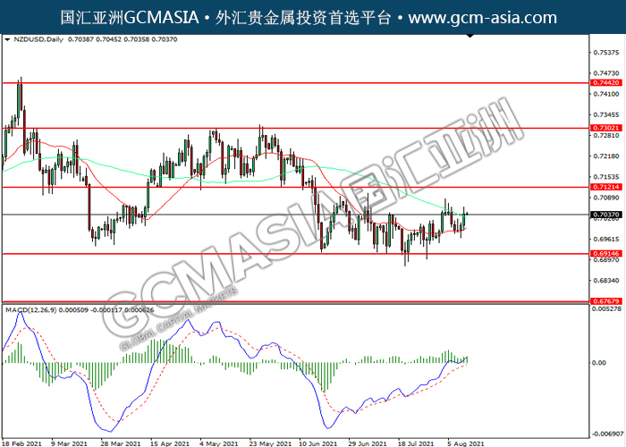 20210812 NZDUSD by willy | Aug 12, 2021 | 纽元兑美元 | 0 comments NZDUSD,Daily: 纽美低位反弹。MACD多头动能略增,短期可关注多头为主。上方关注0.7120和0.7305压力,下方关注0.6915支撑和0.6770支撑。