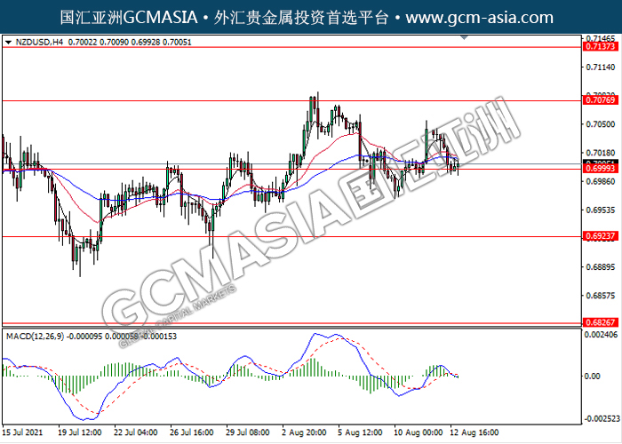 20210813 NZDUSD-午间 by keyk | Aug 13, 2021 | 纽元兑美元 | 0 comments NZDUSD,H4: 纽美高位承压回落,目前测试前期支撑。MACD形成死叉,动能略减,若突破可关注继续关注空头方向为主。上方关注0.7075和0.7135压力,下方关注0.7000支撑和0.6925支撑。