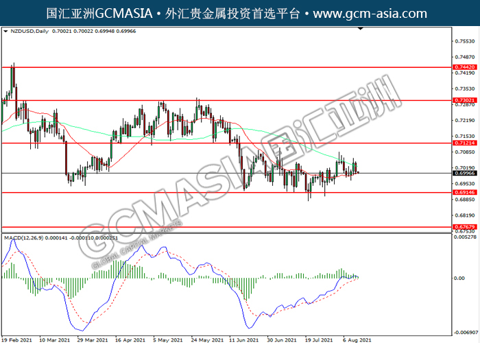 20210813 NZDUSD by willy | Aug 13, 2021 | 纽元兑美元 | 0 comments NZDUSD,Daily: 纽美低位反弹。然而,MACD多头动能略减,短期可关注技术性回调为主。上方关注0.7120和0.7305压力,下方关注0.6915支撑和0.6770支撑。