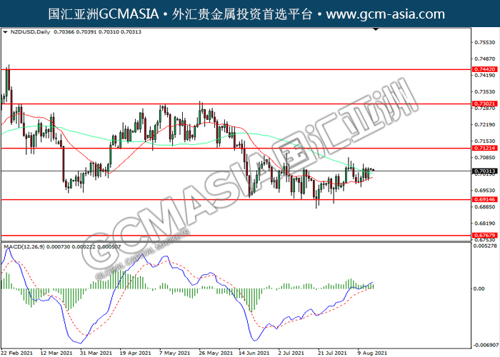 20210816 NZDUSD by willy | Aug 16, 2021 | 纽元兑美元 | 0 comments NZDUSD,Daily: 纽美低位反弹。然而,MACD多头动能略减,短期可关注技术性回调为主。上方关注0.7120和0.7305压力,下方关注0.6915支撑和0.6770支撑。