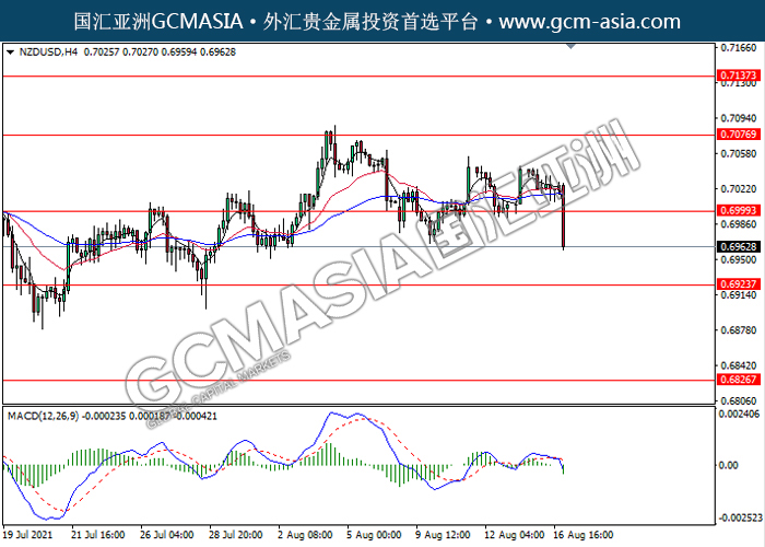 20210817 NZDUSD-午间 by keyk | Aug 17, 2021 | 纽元兑美元 | 0 comments NZDUSD,H4: 纽美突破前期支撑,空头排列。MACD形成死叉,动能略减,中期继续看空为主。上方关注0.7000和0.7075压力,下方关注0.7000支撑和0.6925支撑。