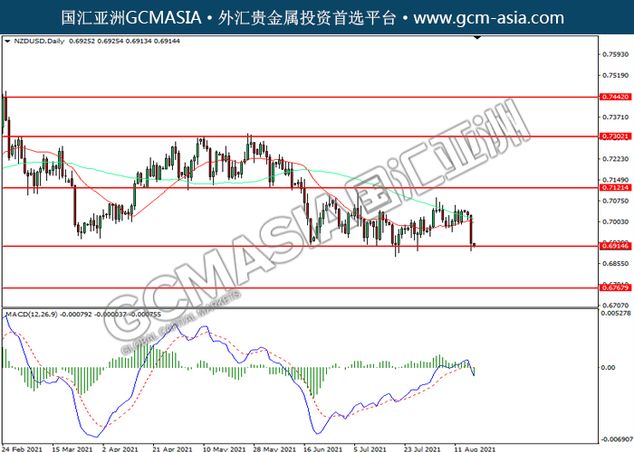20210818 NZDUSD by willy | Aug 18, 2021 | 纽元兑美元 | 0 comments NZDUSD,Daily: 纽美高位回落,目前测试前期支撑。MACD空头动能略增,若下破可关注空头为主。上方关注0.7120和0.7305压力,下方关注0.6915支撑和0.6770支撑。